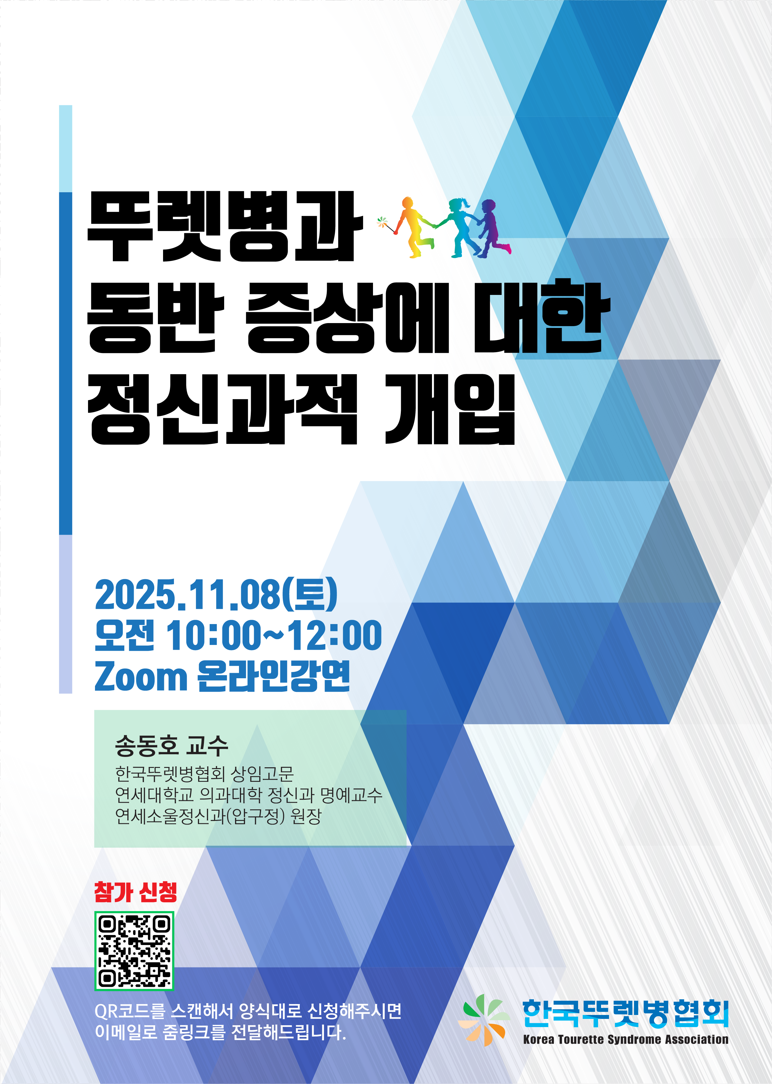 온라인 ZOOM으로 진행되는 이번 강연회는 한국뚜렛병협회 상임고문이자 연세소울정신건강의학과의원 원장이신 송동호 교수님께서 강연하십니다.